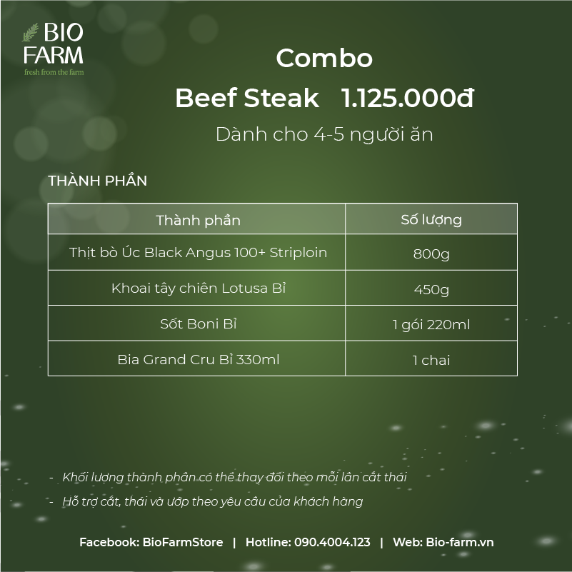 COMBO 2: BEEF STEAK 1.125.000Đ (Dành cho 4-5 người ăn) - 800Gr Thịt bò Úc Black Angus 100+ Striploin - 450Gr Khoai tây chiên Lotusa Bỉ - 01 gói sốt Boni Bỉ 220ml (có 4 vị: nấm, tiêu xanh, bơ trứng và cà ri) - 01 chai bia Grand Cru Bỉ 330ml