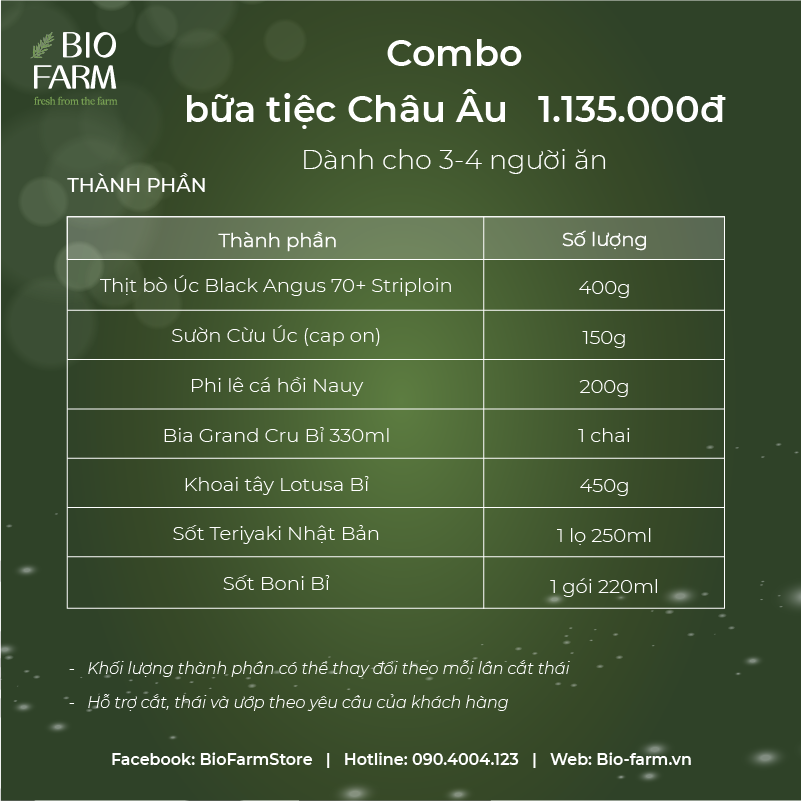 COMBO 3: BỮA TIỆC CHÂU ÂU 1.135.000Đ (Dành cho 3-4 người ăn) - 400Gr thịt bò Úc Black Angus 70+ Striploin - 150Gr sườn cừu Úc (cap on) - 200Gr Phi lê cá hồi Nauy - 01 chai bia Grand Cru 330ml - 450Gr Khoai tây Lotusa Bỉ - 01 lọ Sốt Teriyaki Nhật Bản 250ml - 01 lọ Sốt Boni Bỉ 220ml (có 4 vị: nấm, tiêu xanh, bơ trứng và cà ri)