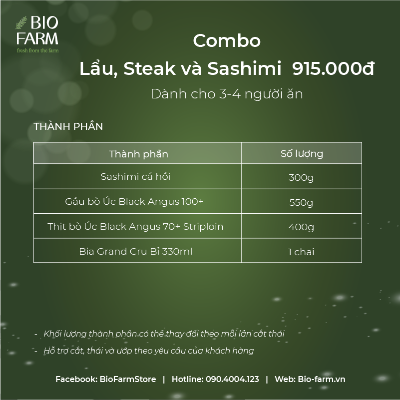 COMBO 1: LẨU, STEAK VÀ SASHIMI CÁ HỒI 915.000Đ (Dành cho 3-4 người ăn) - 300Gr Sashimi cá hồi Nauy (tặng kèm lá tía tô, nước tương, mù tạt, gừng hồng) - 550Gr Gầu bò Úc Black Angus 100+ thái Lẩu - 400Gr Thịt bò Úc Black Angus 70+ làm Steak - 01 chai chia Grand Cru Bỉ 330ml