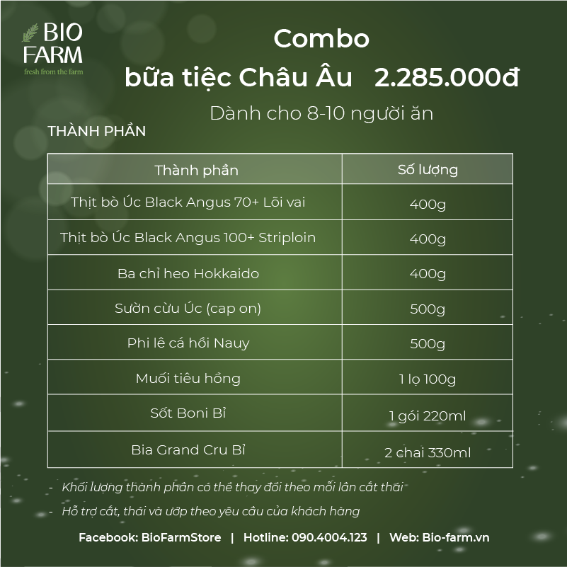 COMBO 4: BỮA TIỆC CHÂU ÂU 2 - 2.285.000Đ (Dành cho 8-10 người ăn) - 400Gr thịt bò Úc Black Angus 70+ Lõi vai - 400Gr thịt bò Úc Black Angus 100+ Striploin - 400Gr ba chỉ heo Hokkaido - 500Gr sườn cừu Úc (cap on) - 500Gr Phi lê cá hồi Nauy - 02 chai Grand Cru 330ml - 01 lọ muối tiêu hồng 100Gr - 01 lọ Sốt Boni Bỉ 220ml (có 4 vị: nấm, tiêu xanh, bơ trứng và cà ri)
