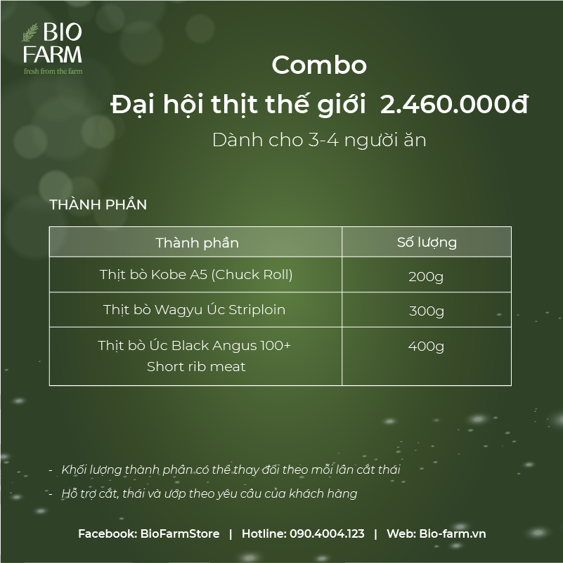 COMBO 5: ĐẠI HỘI THỊT THẾ GIỚI - 2.460.000Đ (Dành cho 3-4 người ăn) - 200Gr thịt bò Kobe A5 (Chuck Roll) - 300Gr thịt bò Wagyu Úc Striploin - 400Gr thịt bò Úc Black Angus 100+ Short Rib Meat