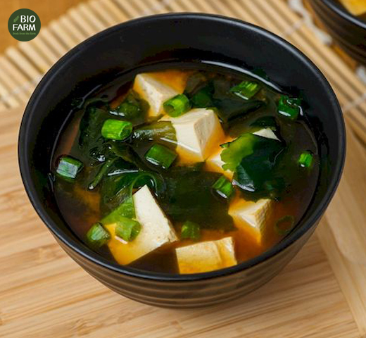 Súp Miso truyền thống của Nhật Bản. Phần nước dùng (dashi) nấu cùng tương miso, đậu phụ, rong biển mang lại hương vị thơm ngon và nhiều lợi ích như ngăn ngừa loãng xương, điều trị các bệnh về khớp, hạn chế khả năng ung thư