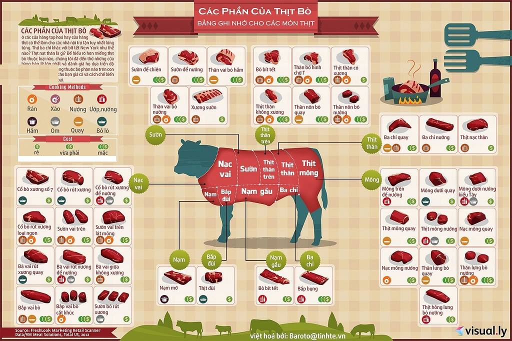 Một số phần thịt trên con bò và cách chế biến các món ăn phù hợp