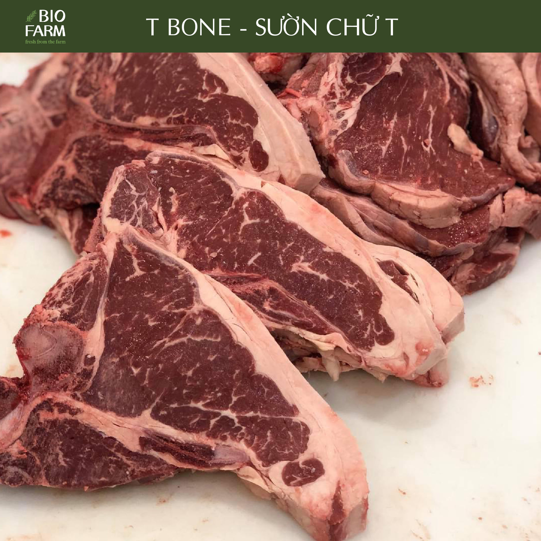 Miếng cắt T Bone có đến 2 phần thịt ngon nhất ở trên cùng một miếng steak, được ngăn cách bởi phần xương cắt hình chữ T. Phần thịt nhỏ hơn là Tenderloin, phần lớn hơn là Striploin. Nhờ giữ nguyên xương chữ T nên ở nhiệt độ cao, miếng steak vẫn đủ mềm mà không bở, chắc mà không cứng.